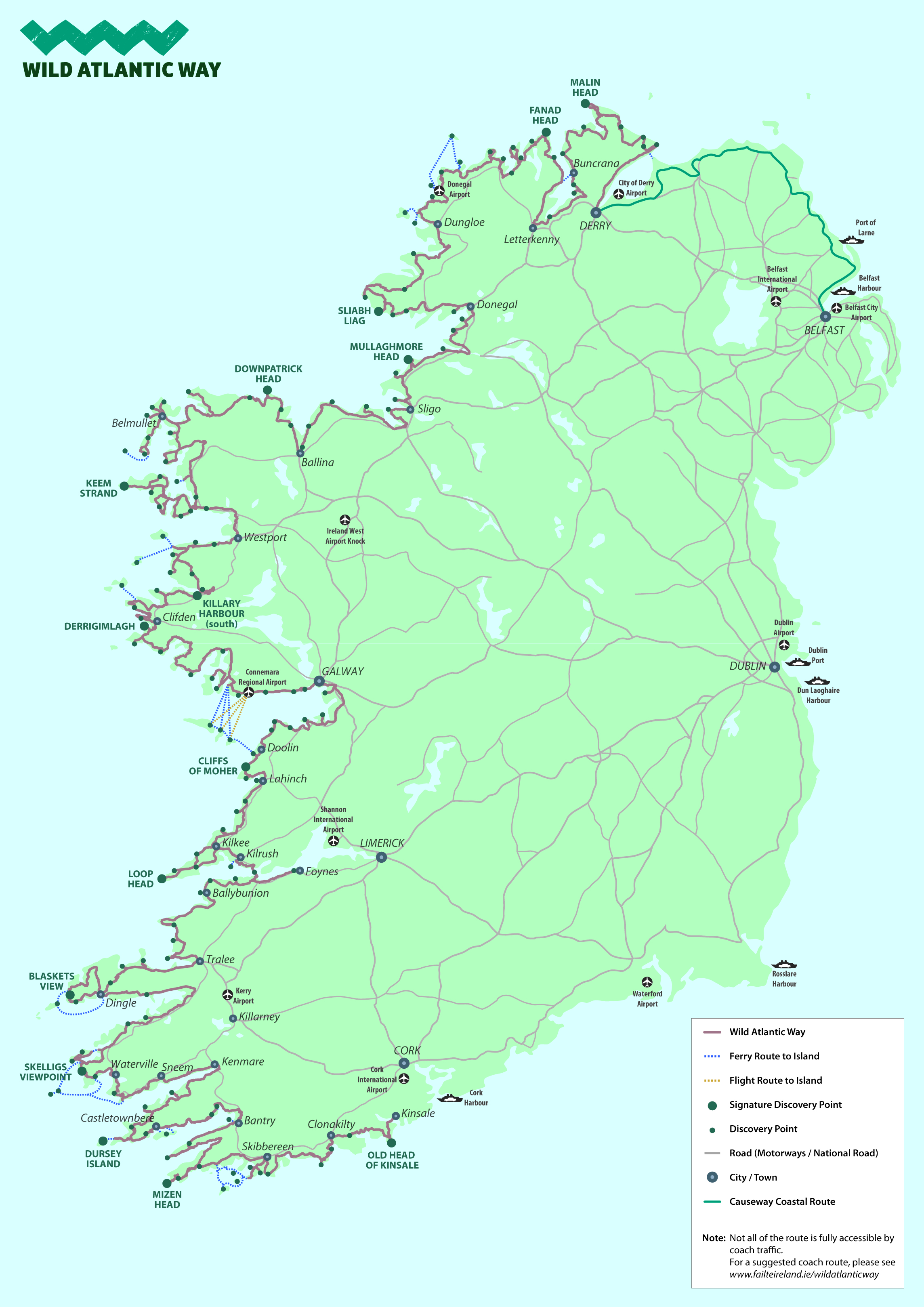 La Wild Atlantic Way è il più lungo e definito itinerario costiero del mondo : 2,500 chilometri si estendono dalla Contea di Donegal all’inizio della città di Cork. Alcuni luoghi nel percorso vi guidano attraverso i loro paesaggi. Si possono avere varie alternative di itinerario, infatti, poca gente segue tutto il percorso,altre invece ne creano una personale. La strada è praticabile con qualsiasi mezzo di trasporto. Li, attraverserete tanti bellissimi paesaggi, specialmente a metà strada, troverete la famosa città di Galway. Fare un viaggio nella Wild Atlantic Way non è una competizione sportiva, è soprattutto un viaggio indimenticabile, in un posto che incarna la vera definizione di bellezza.