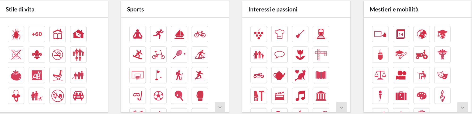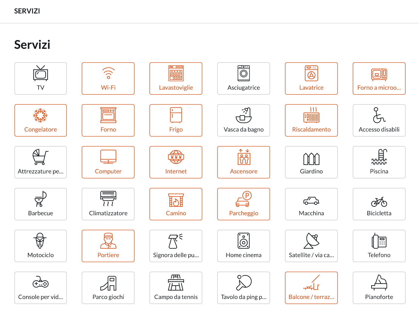 Controlla l'elenco dei potenziali servizi e seleziona quelli che sono presenti nella tua casa (quando hai selezionato un Servizio, verrà visualizzato in arancione). Se hai una macchina, una piscina o qualsiasi altro oggetto che vorresti condividere con i tuoi prossimi partner di scambio, puoi selezionarli in questa sezione!
