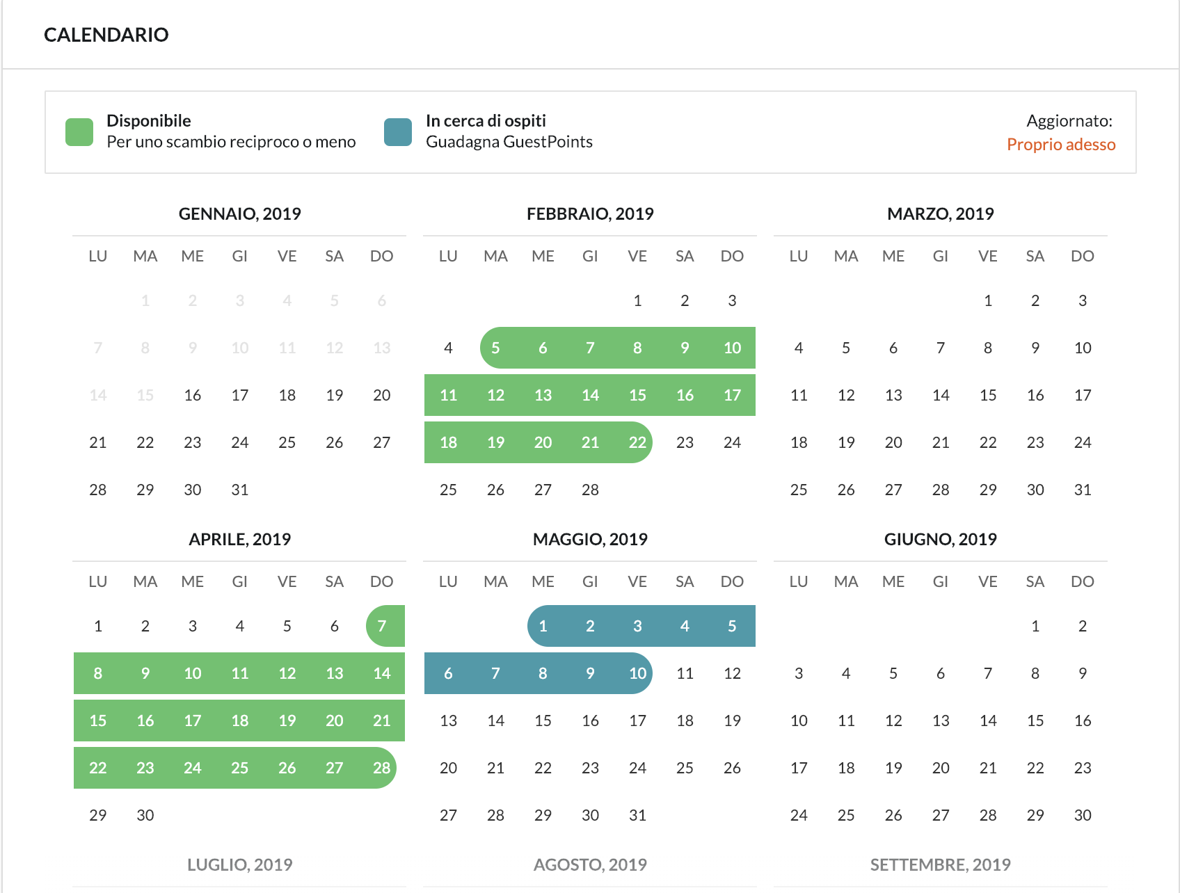 - Quando finalizzi uno scambio su HomeExchange, quel periodo apparirà automaticamente come un periodo non disponibile (rosso) sul tuo Calendario.