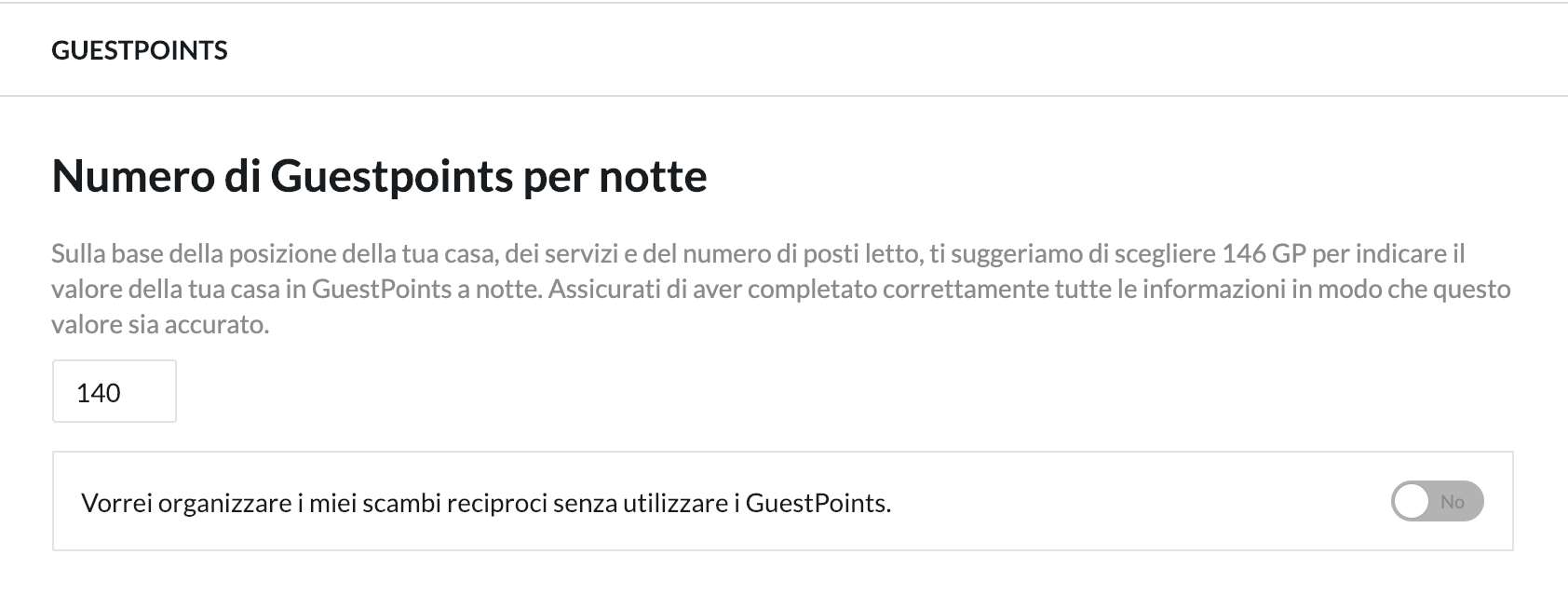 In base alla posizione della tua casa, ai servizi e al numero di posti letto, HomeExchange ti suggerirà il numero di GuestPoints per notte della tua casa. Assicurati di aver inserito tutte le tue informazioni di casa correttamente in modo che il tuo importo sia rappresentativo della tua casa. Tuttavia, se si preferisce modificare questo numero, è possibile aumentarlo fino ad un massimo di + 30 GP o diminuirlo a piacere. Potresti persino offrire la tua casa per 0 GuestPoints a notte.