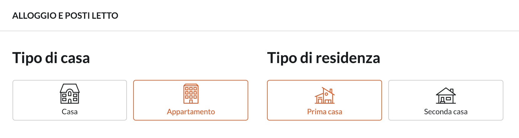 Seleziona il tipo di Casa e Residenza che corrisponde alla tua: Casa o Appartamento e Residenza Primaria o Secondaria. Questo è molto importante in quanto puoi filtrare nelle tue ricerche per le residenze primarie o secondarie!