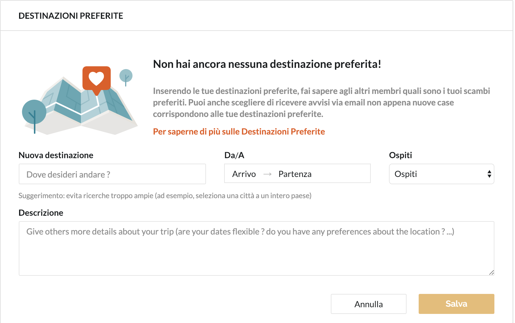 Salvando le tue Destinazioni Preferite, crei un avviso automatico che ti invia un'email ogni volta che una casa che soddisfa le tue preferenze di ricerca viene aggiunta su HomeExchange. Per ogni destinazione preferita inclusa, è possibile aggiungere dettagli specifici come: date in cui si desidera viaggiare, numero di viaggiatori e una breve descrizione.