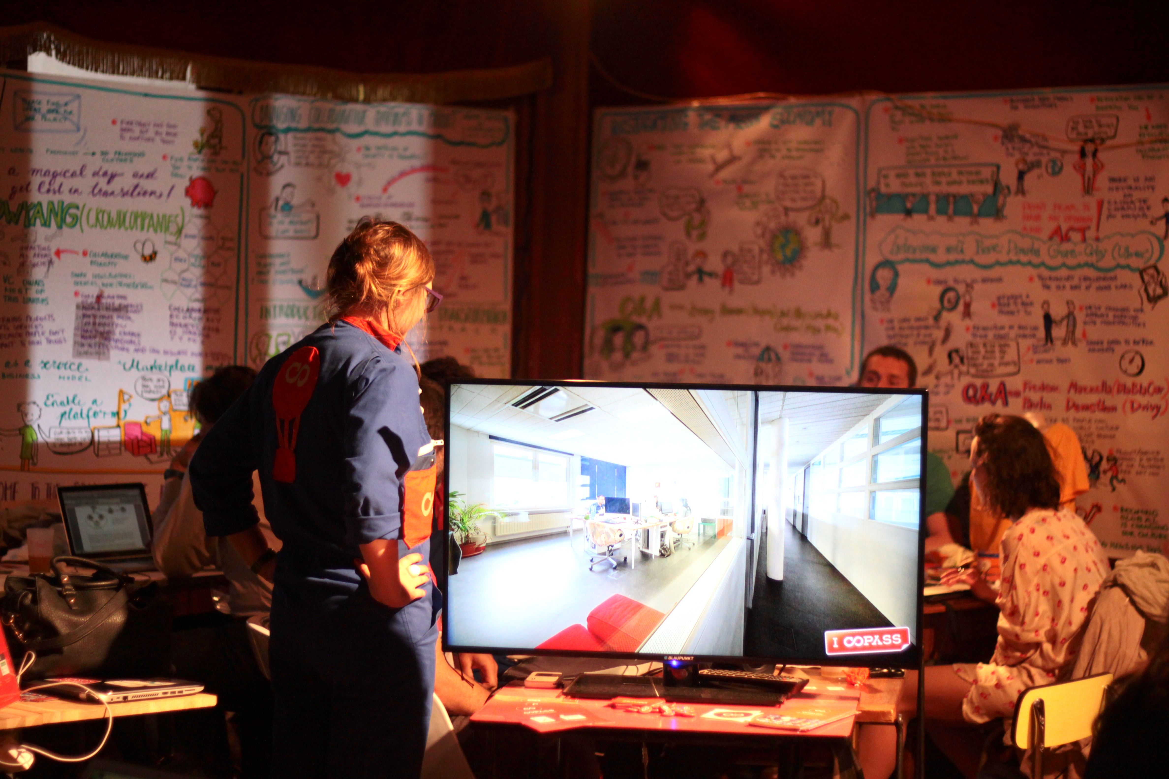 Il posto sembra essere scelto alla perfezione, il tempo è bellissimo, che rende le installazioni esterne molto piacevoli. Siamo accolti in uno spazio di co-working, con un angolo in cui sono disponibili per tutti tanti libri sull’economia collaborativa.