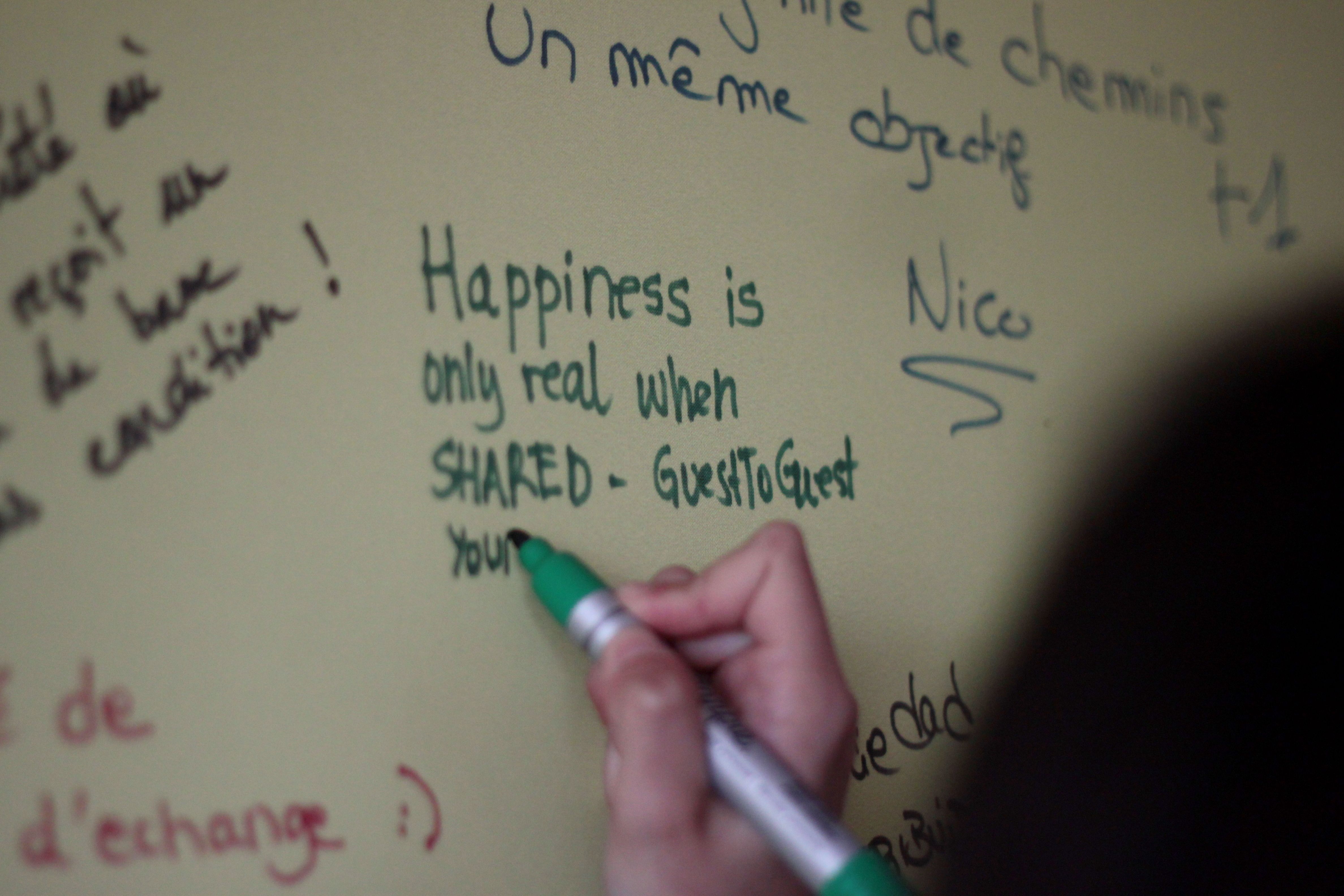 L’ora di pranzo sta arrivando. Tutto è stato pianificato per persone venute sole. Un angolo chiamato “lunch blind date” permette di lasciare una traccia del suo passaggio. Si può invitare una persona che non si conosce a pranzare con te, scrivendolo su un foglio. Abbiamo pescato un invito di Charles Eisenstein, ma purtroppo non l’abbiamo trovato. Niente di male, perché siamo stati in prima linea durante il suo Workshop *Dopo il capitalismo? Reinventiamo tutto! *che ha avuto luogo più tardi nel pomeriggio.